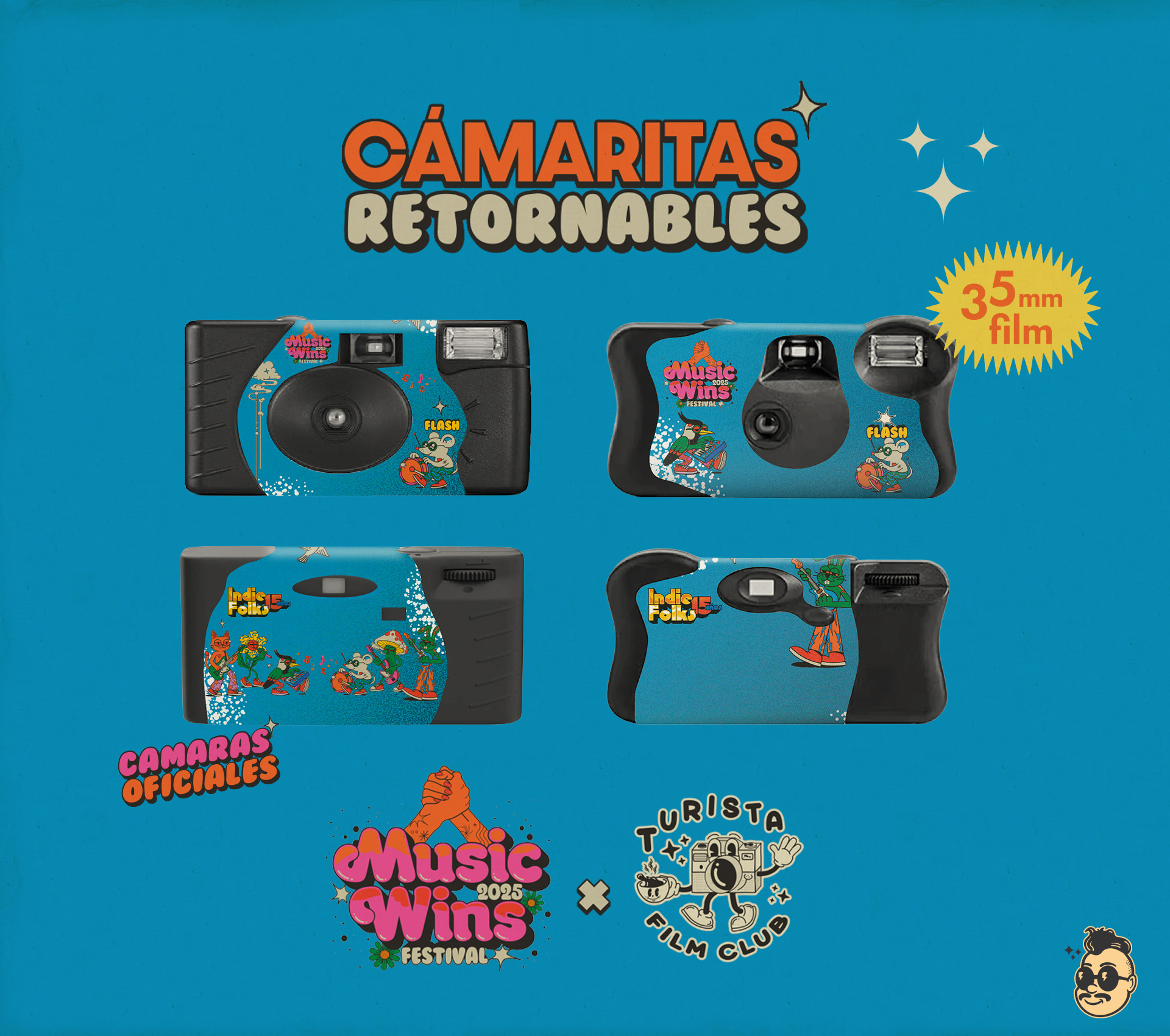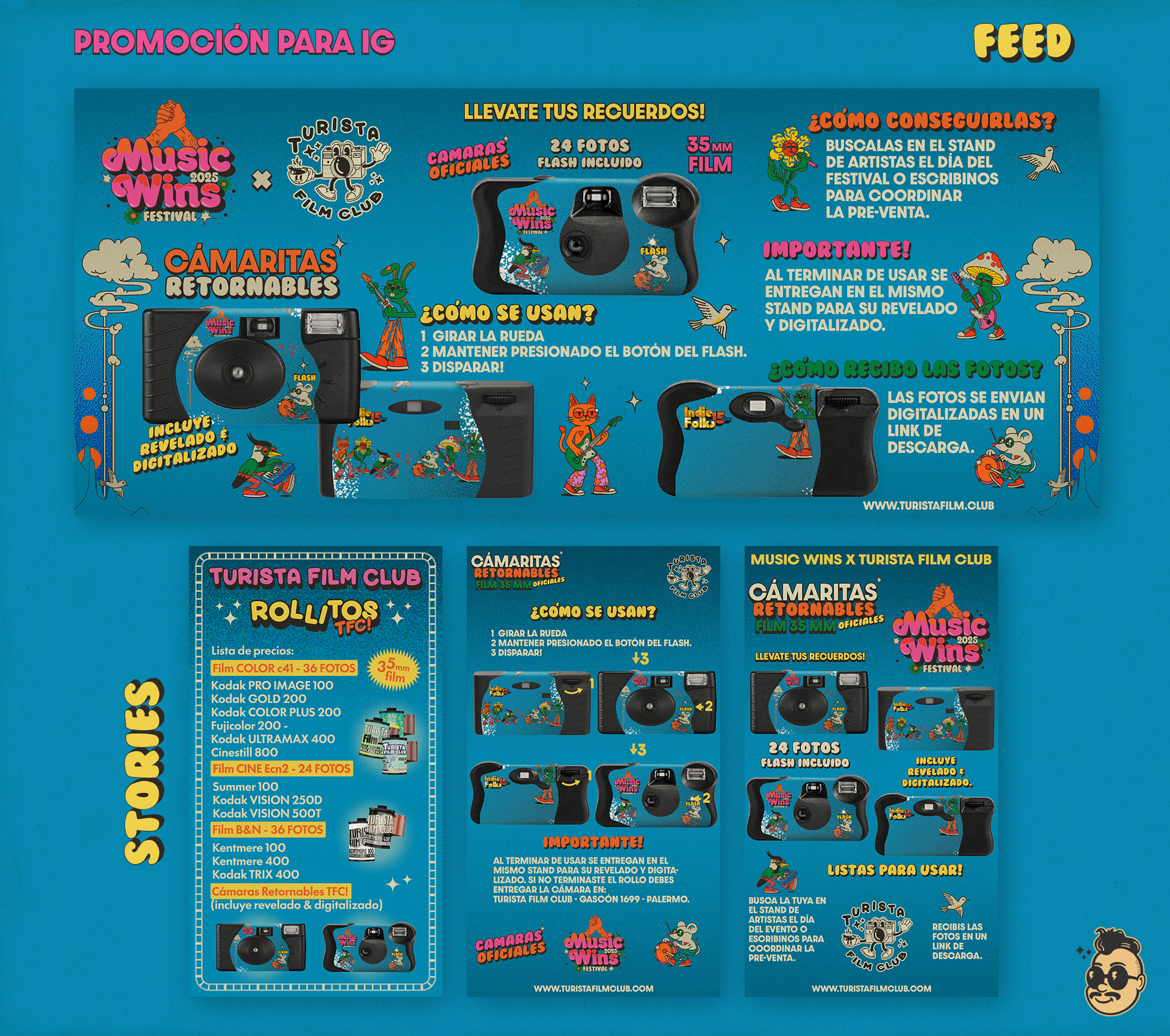 Diseño de Cámaras fotográficas oficiales Music Wins 2025 Festival - Trabajo para TFC! MWxTFC! + Cartelería para stand de artistas & promo para redes sociales.